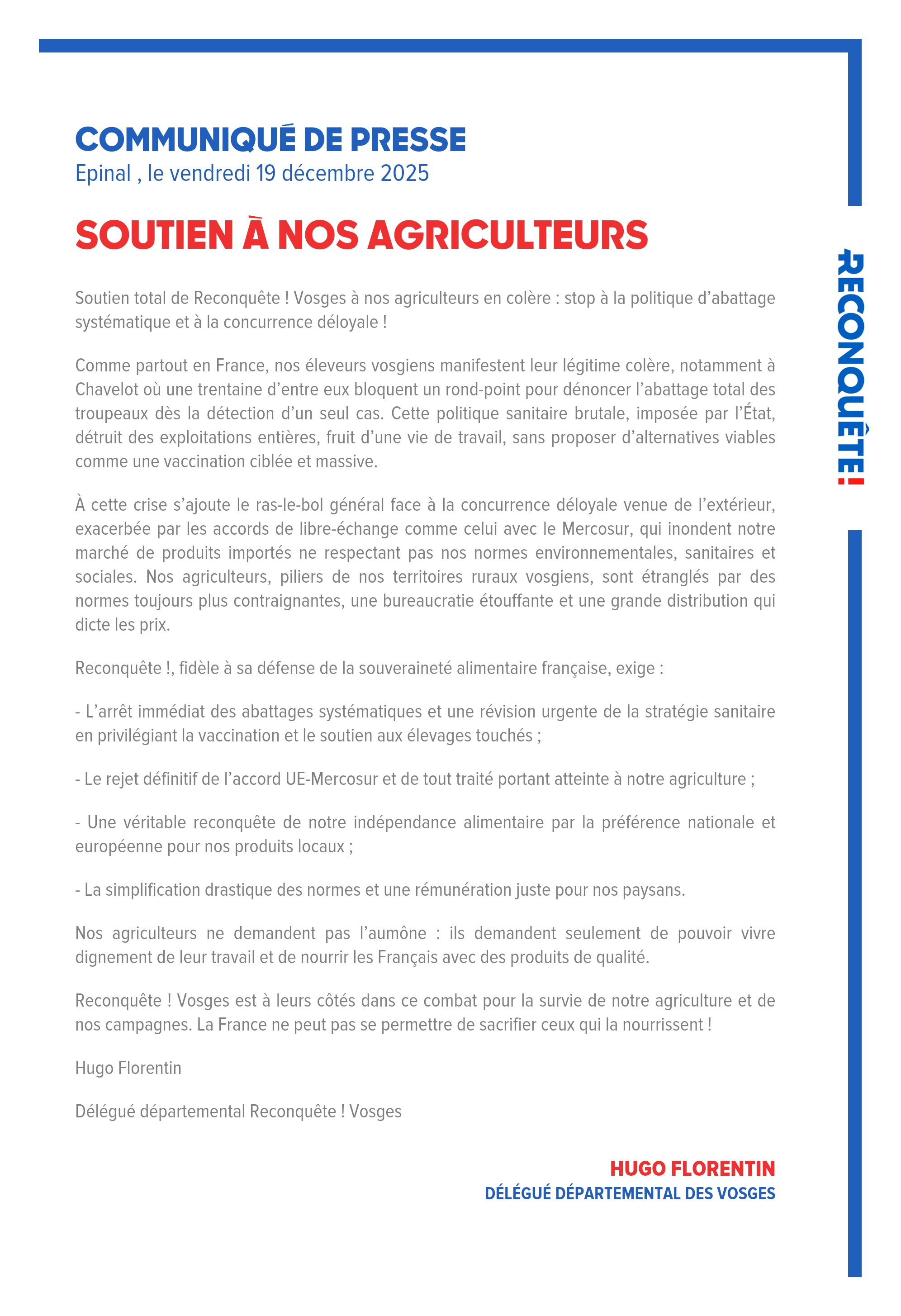 Reconquête ! Vosges est à leurs côtés dans ce combat pour la survie de notre agriculture et de nos campagnes. La France ne peut pas se permettre de sacrifier ceux qui la nourrissent !